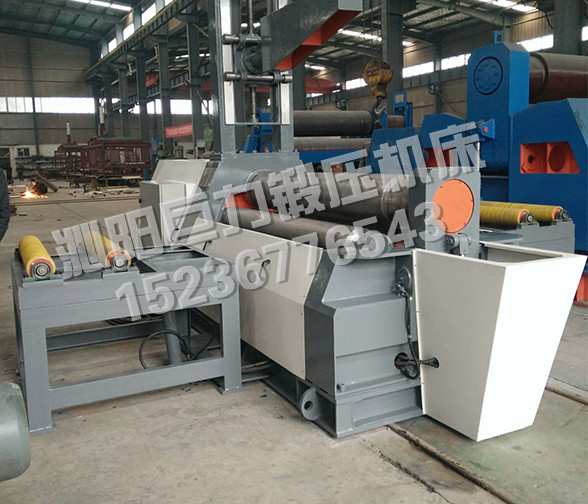 該四輥卷板機(jī)與對稱三輥卷板機(jī)比較,它可以不借助其它設(shè)備模具,直接予彎板材端部,而且剩余直邊較小;它可以不使板材調(diào)頭,而卷成工件。